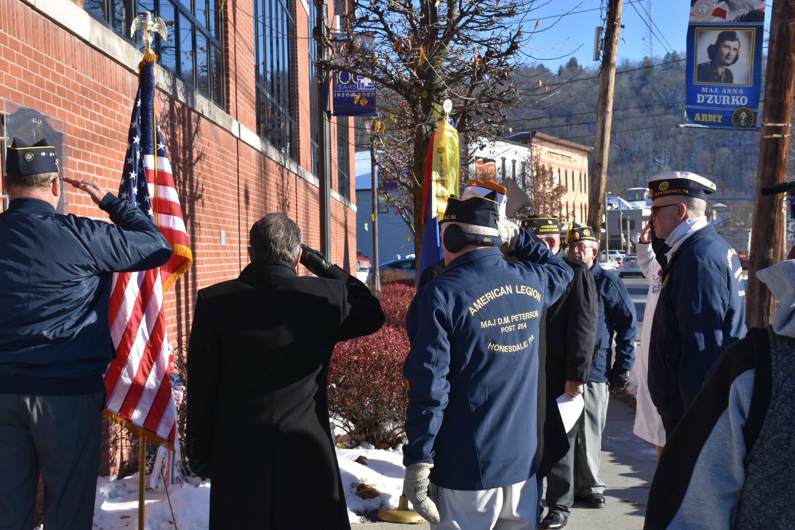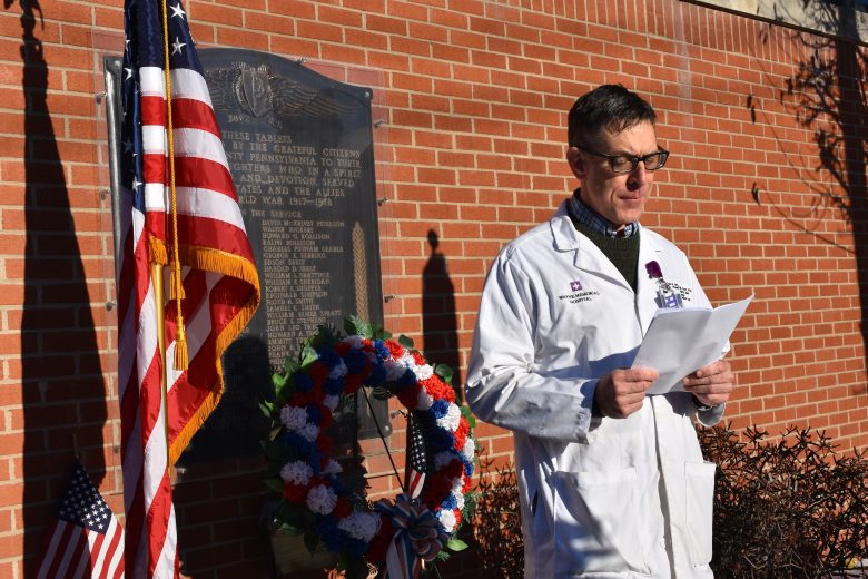 (Honesdale, PA December 5, 2025)…The annual wreath laying ceremony was held at Wayne Memorial Hospital (WMH) this morning in recognition of Pearl Harbor Day, December 7th and to honor the heroic members of our armed forces who served that fateful day 84 years ago. Veterans from VFW Post 531, American Legion Post 254, and members of the WMH administration and staff attended the solemn ceremony. Army veteran and WMH Chief of Medical Staff Dr. Sean McVeigh, FCCP, FACP, led the ceremony followed by an opening statement by Hugh Rechner, a former U.S. Army pilot who served two tours in the Vietnam War and past chairman of the WMH Board of Trustees.